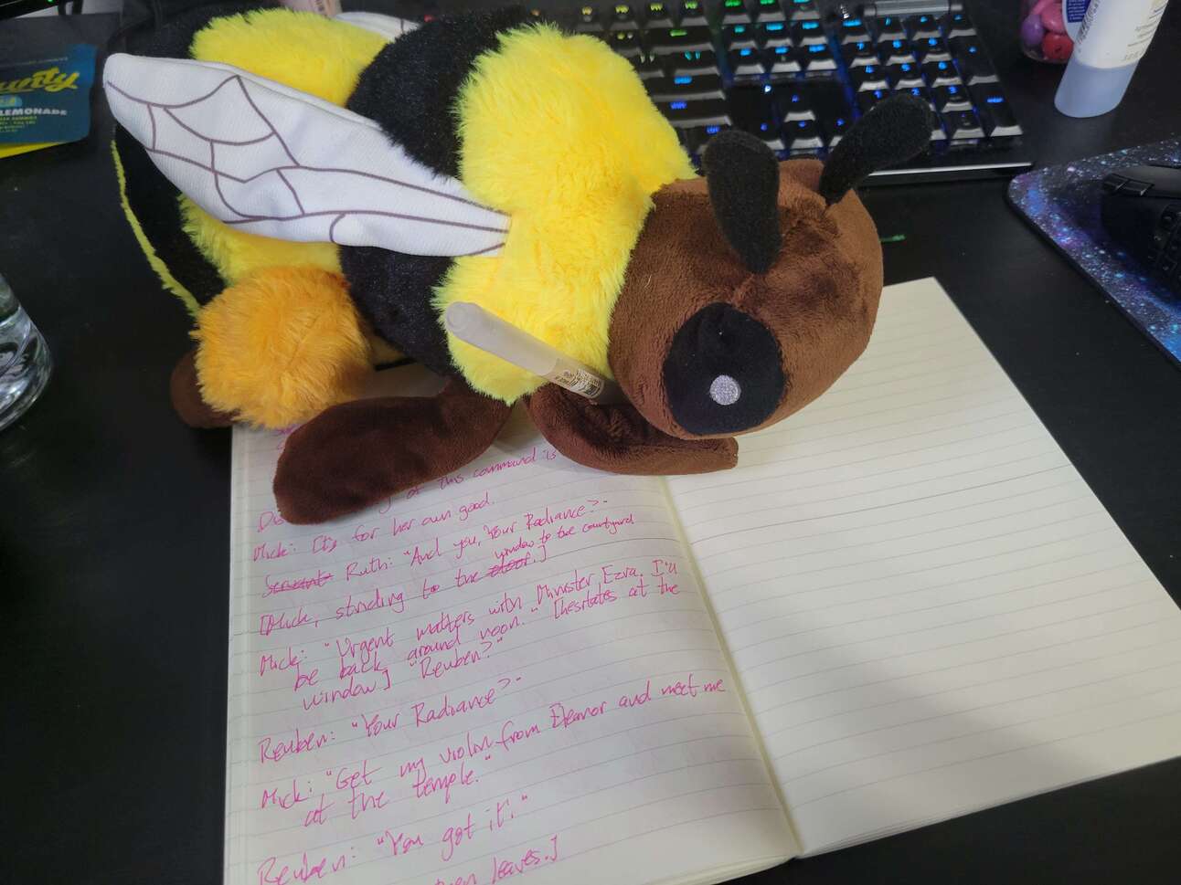 [A plush honeybee sits on an open notebook with its front legs wrapped around a pen. The page it’s sitting on is full of writing; the one it’s poking a pen onto is blank.]