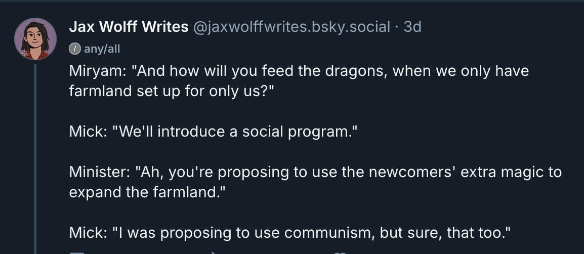 Bsky is still very active and rife with writing events, but whenever a pitch event swings around, it’s like everyone comes out in droves, in one giant block party for writing. You get to see what everyone else is doing, you get to see people root for you, and you get to pick up tips that help you refine the pitch you’ll eventually stick into query packages. To me, it’s not super serious. It’s just an opportunity to practice and connect. That’s all.